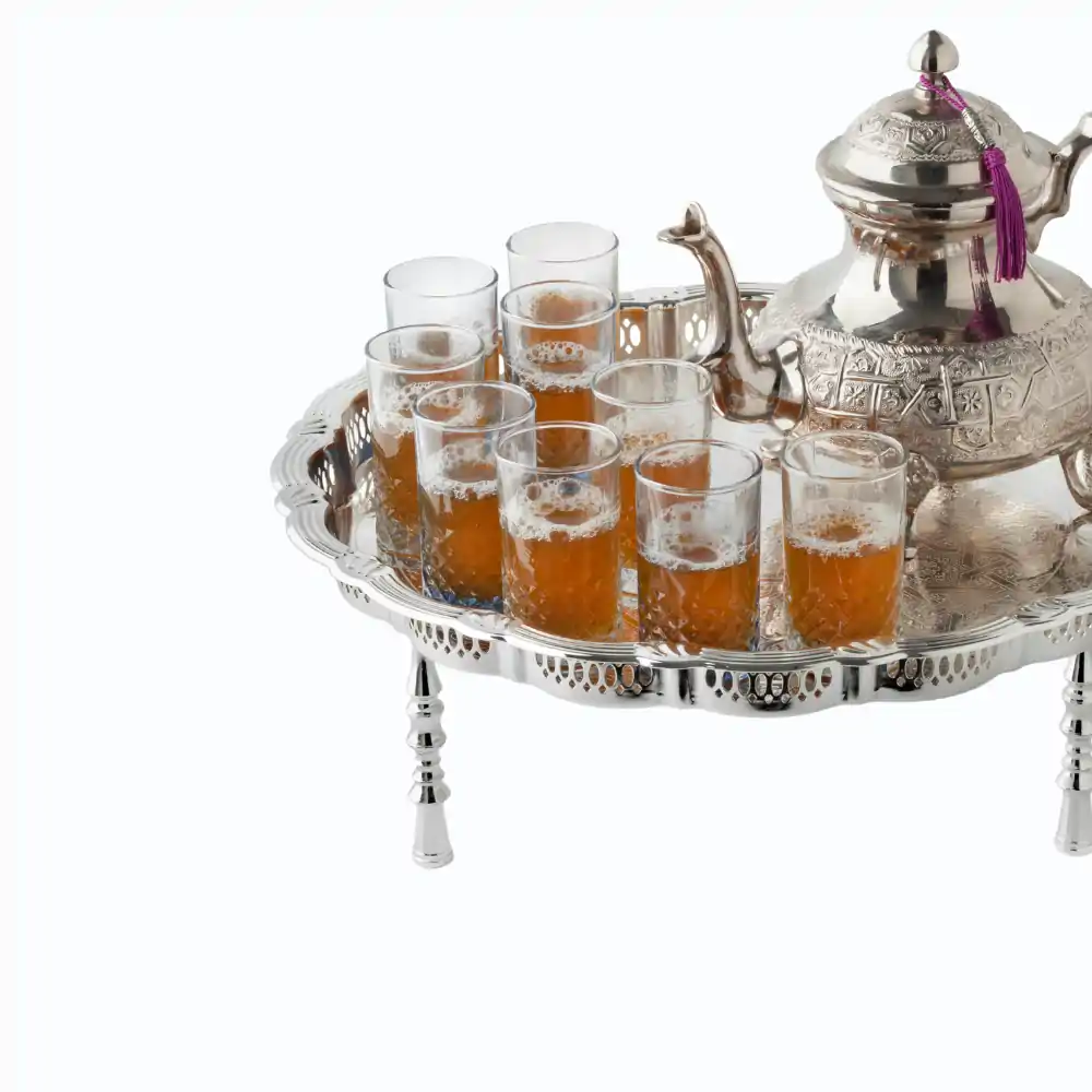 The Moroccan tea set is as much a part of the ritual as the tea itself. Each component—teapot, glasses, tray, and accessories—is a testament to centuries of craftsmanship and cultural exchange. Let’s break down the elements of a traditional Moroccan tea set, as described by artisans at Marrakeche Crafts.